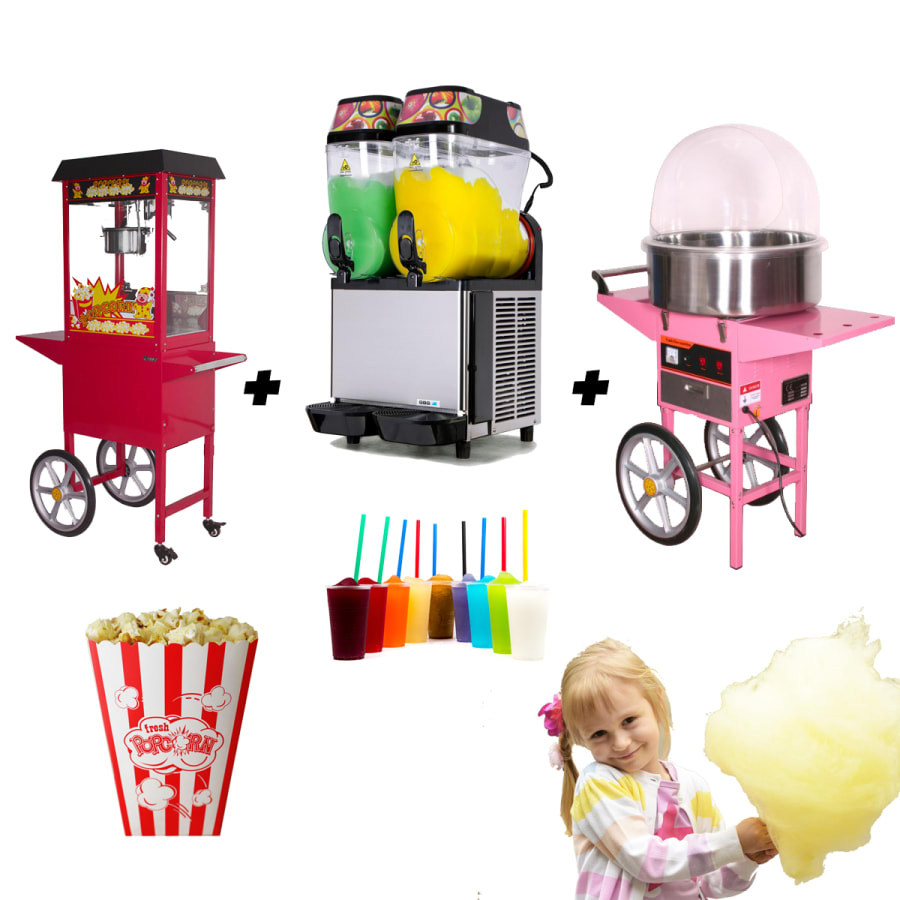 The package includes a 2 Barrel Slushie Machine, Fairy Floss machine and a Popcorn machine.
